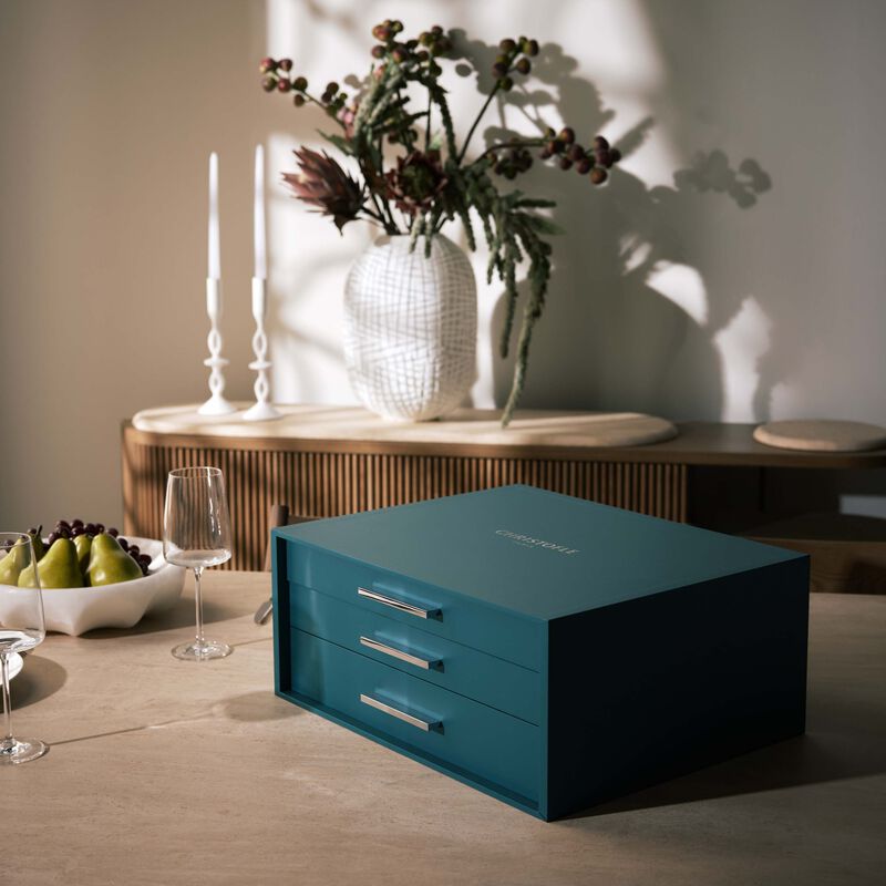 لا يوجد مكان أفضل لتخزين أدوات المائدة الفضية من هذا الصندوق عالي الجودة المصمم لاستيعاب 125 قطعة، يأتي مُبطَّنًا بمادة مُميزة تشبه الجلد المدبوغ تساعد على منع تآكل السكاكين والشوك والملاعق.