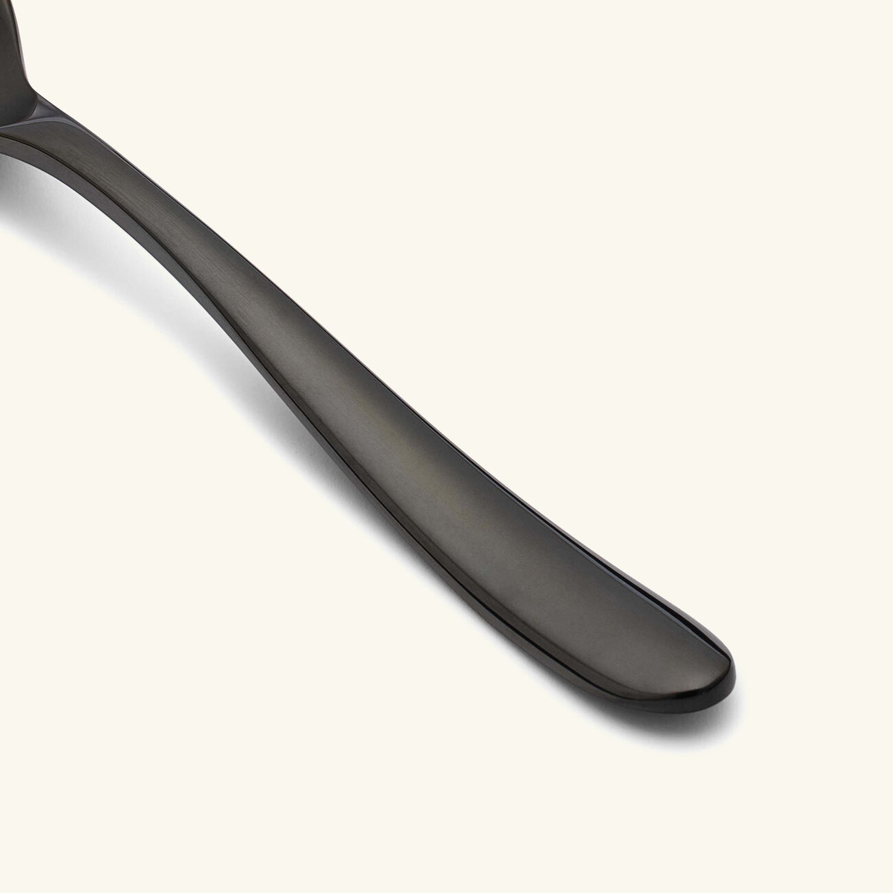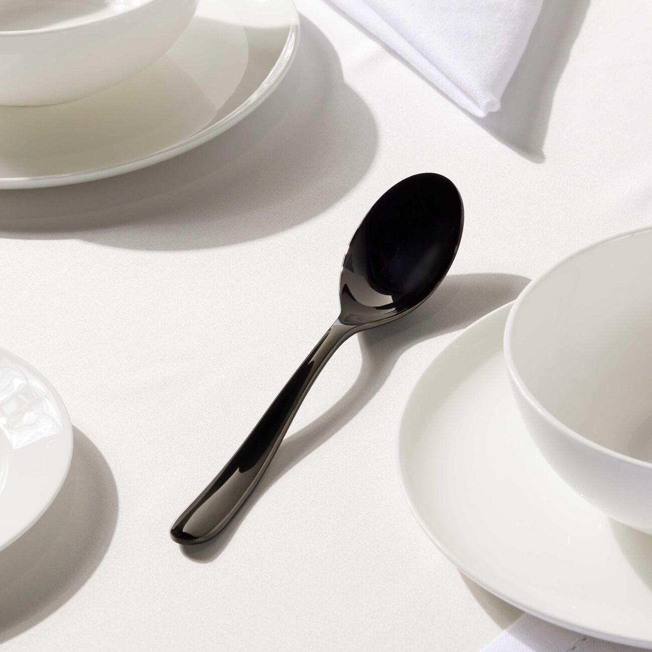 Stainless steel soup spoon in black. The black coloring is obtained by applying colored metal alloys to the surface of the flatware. This process enhances the pure lines of the flatware and adds an dash of modernity to the finest tables.