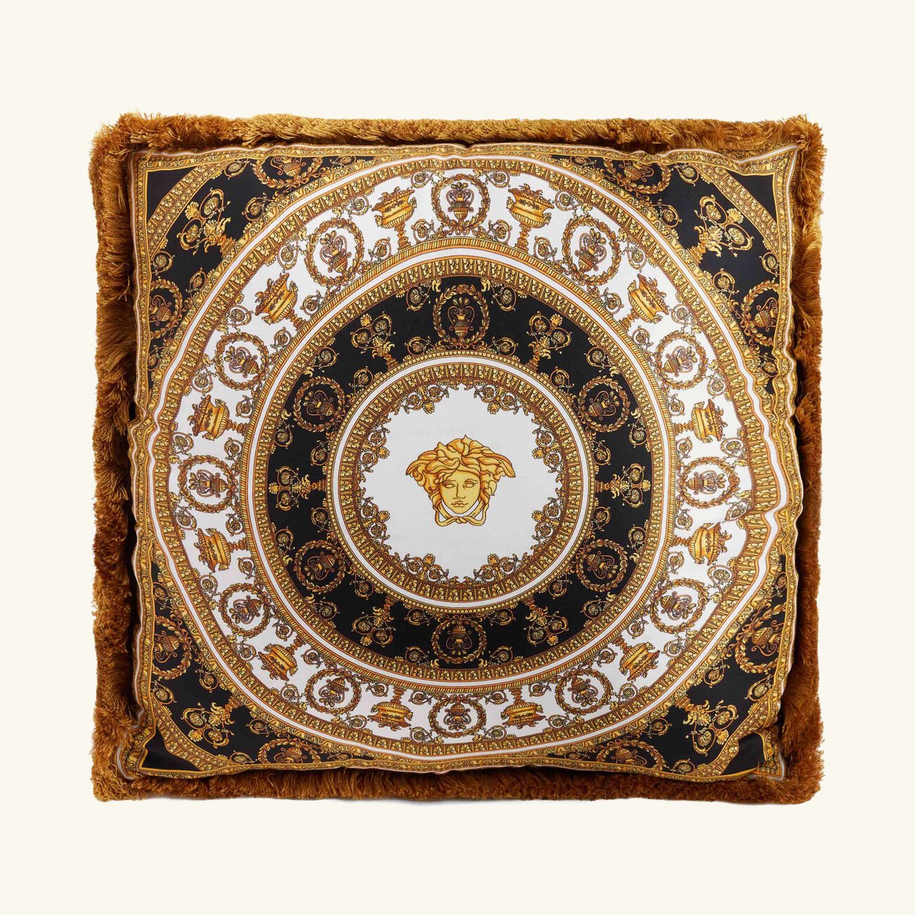This cushion will enhance your decor while bringing out the best in your stylish yet contemporary sofas and chairs. It has a square shape, a velvety appearance, a padded design, patterns in shades of brown, gold, black, and white, a Medusa print in the middle, and a fringed border. It will undoubtedly give your modern home character and timeless charm, whether you combine it with plainer styles or add a couple to your interiors.